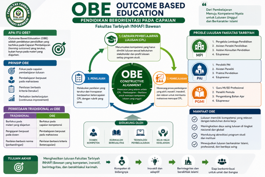 Dalam upaya meningkatkan kualitas lulusan, Fakultas Tarbiyah INHAFI Bawean terus melakukan penguatan sistem kurikulum berbasis Outcome-Based Education (OBE). Hal ini didasarkan pada kenyataan bahwa kualitas perguruan tinggi saat ini tidak lagi hanya diukur dari nilai akademik mahasiswa, tetapi lebih pada kompetensi nyata yang dimiliki lulusan.
