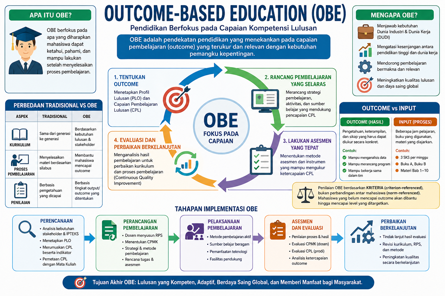 OBE adalah Pendekatan pendidikan yang berfokus pada capaian pembelajaran (learning outcomes) yang harus dimiliki lulusan.